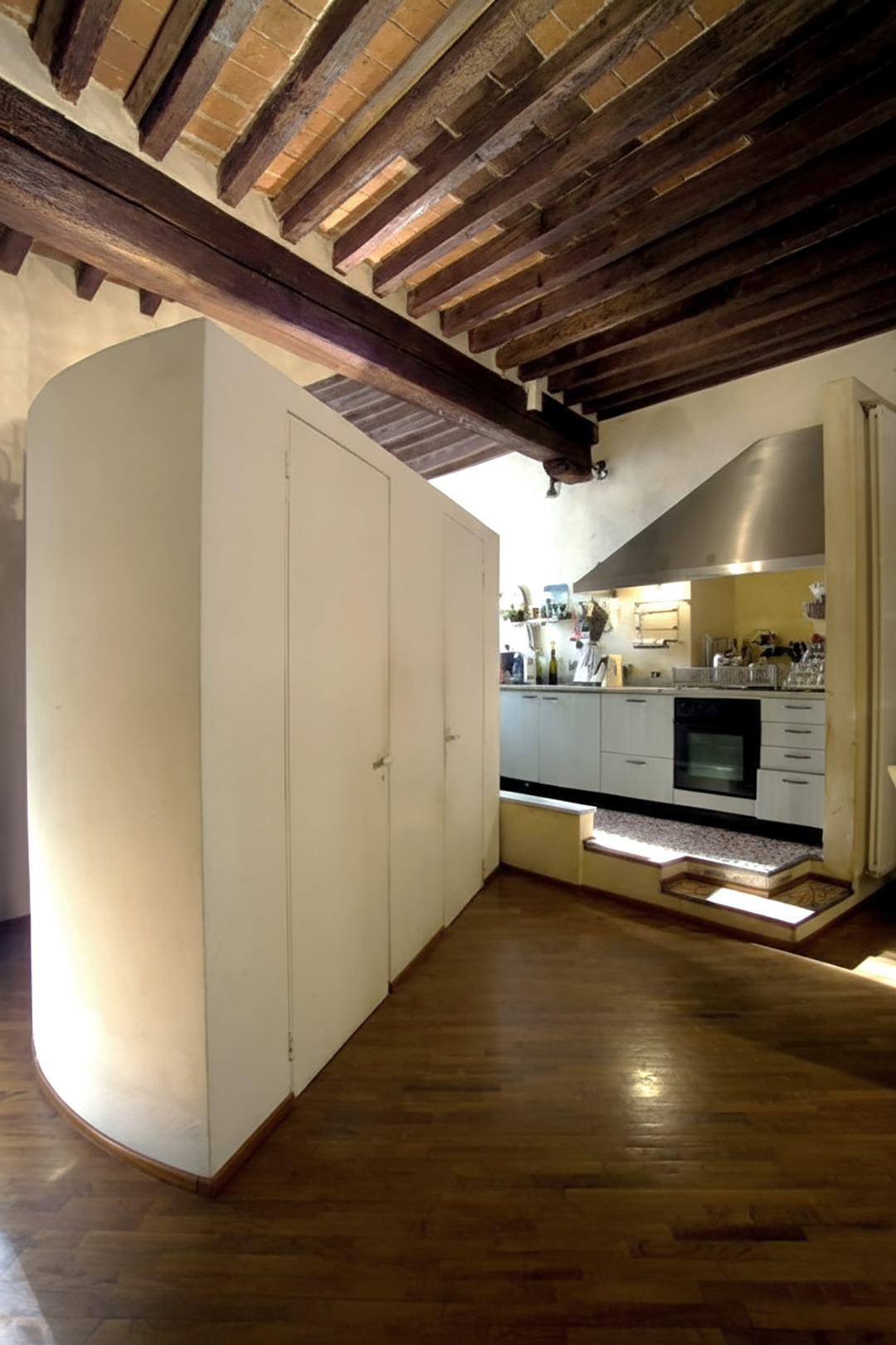 Interpretazione spaziale di appartamento al primo piano di Palazzo Busdraghi, in via Fillungo. Il tema è stato quello di esaltare e rispettare le strutture portanti, i materiali delle murature, le caratteristiche dello storico palazzo, la splendida trifora collocata nella zona giorno, mantenendo al contempo la necessaria funzionalità.