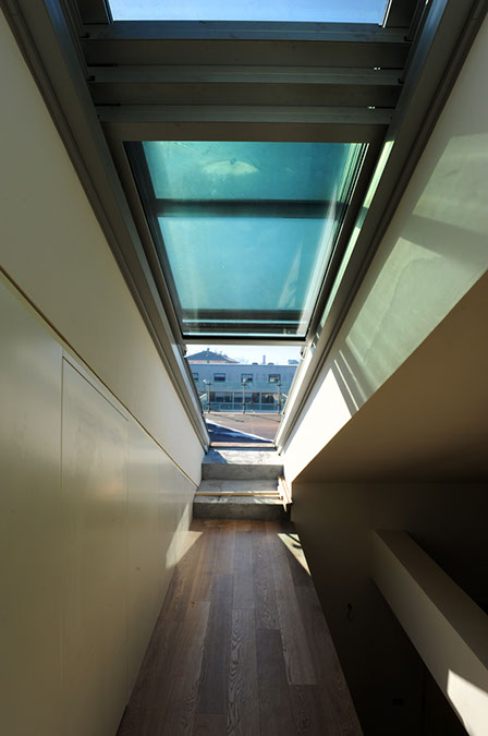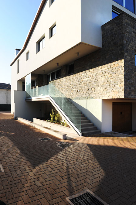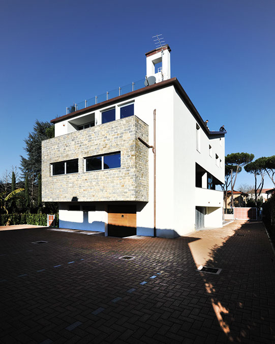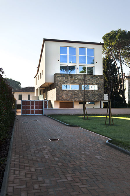 L’intervento si inserisce lungo un viale, in gran parte edificato agli inizi del Novecento, di edilizia pregiata, dove le restrizioni dettate dalla normativa e le distanze dai lotti limitrofi alla strada sono stati elementi determinanti nella scelta della ricerca e della produzione architettonica. La divisione fra il volume composto dal seminterrato e dal piano terra, che ospita due appartamenti, e quello del piano primo, in parte duplex dove troviamo due appartamenti, ha permesso di soddisfare le esigenze funzionali e distributive del committente.