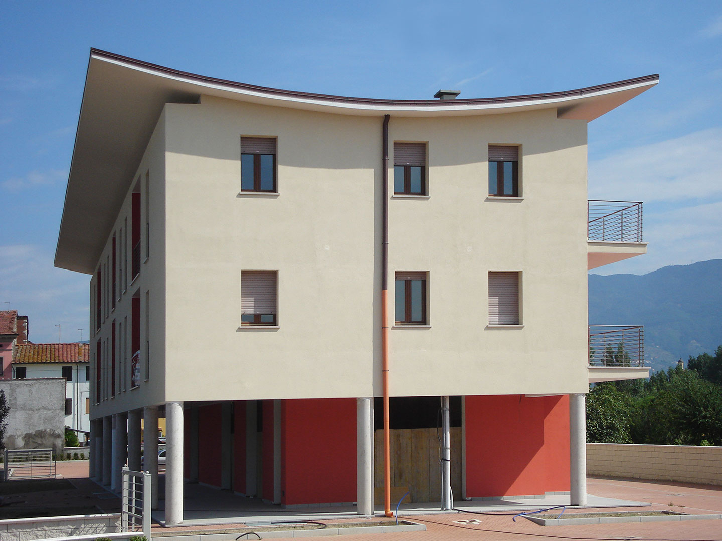 Complesso residenziale per 10 appartamenti e spazio commerciale a Lammari. Su un lotto dalla forma stretta e allungata, precedentemente occupato da un ex-salumificio, si è realizzato un edificio di nuovo impianto diviso in due parti: una superiore e una inferiore, che ospita 10 appartamenti e vari spazi commerciali. Ciascun corpo è stato oggetto di ricerche progettuali separate e indipendenti. La loro unione volumetrica ha conferito una forte organicità al manufatto architettonico, completata dall’introduzione di un ulteriore volume: la copertura a sbalzo, disegnata sulla base di una forma concava ricoperta in rame, che assume in sé un forte carattere animando la piccola creatura architettonica.