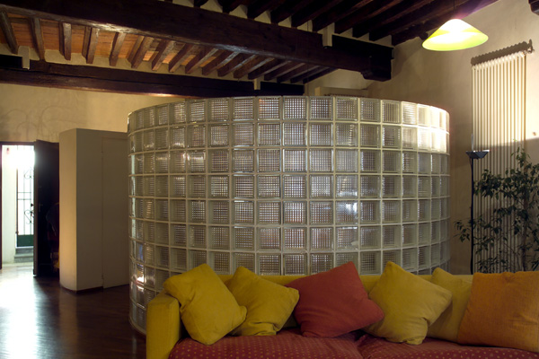 Interpretazione spaziale di appartamento al primo piano di Palazzo Busdraghi, in via Fillungo. Il tema è stato quello di esaltare e rispettare le strutture portanti, i materiali delle murature, le caratteristiche dello storico palazzo, la splendida trifora collocata nella zona giorno, mantenendo al contempo la necessaria funzionalità. La soluzione è stata trovata con un progetto che definisce e crea gli spazi funzionali attraverso quinte murarie e volumi che risultano calati autonomamente ed inseriti nell’ambiente senza alterare la struttura storica, accentuando il distacco dall’edificio storico, contenitore, e il contenuto.